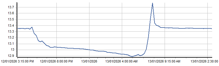 | PROVISIONAL WATER INFORMATION Site: 418001-Pallamallawa HS2 - Battery Volts Report generated: 13 Jan 2026 @ 13:40 AEST | ||||||||||||||||