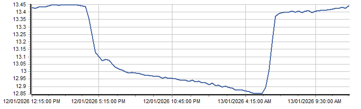 | PROVISIONAL WATER INFORMATION Site: 416011-Roseneath HS2 - Battery Volts Report generated: 13 Jan 2026 @ 10:09 AEST | ||||||||||||||||