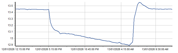 | PROVISIONAL WATER INFORMATION Site: 417001-Gundablouie HS2 - Battery Volts Report generated: 13 Jan 2026 @ 10:09 AEST | ||||||||||||||||