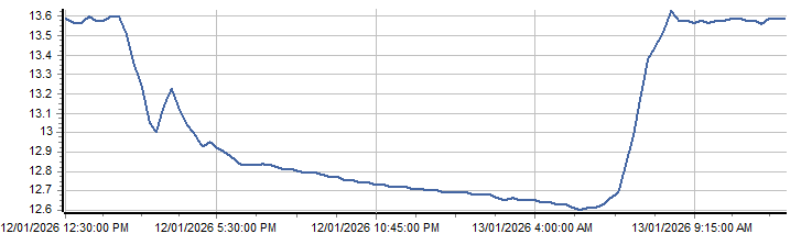 | PROVISIONAL WATER INFORMATION Site: 419053-Black Springs - Battery Volts Report generated: 13 Jan 2026 @ 10:31 AEST | ||||||||||||||||