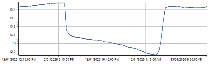 | PROVISIONAL WATER INFORMATION Site: 419054-Limbri HS2 - Battery Volts Report generated: 13 Jan 2026 @ 10:10 AEST | ||||||||||||||||
