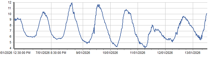 | PROVISIONAL WATER INFORMATION Site: 212054-Wallerwang - Dissolved Oxygen Conc Report generated: 13 Jan 2026 @ 10:23 AEST | ||||||||||||||||