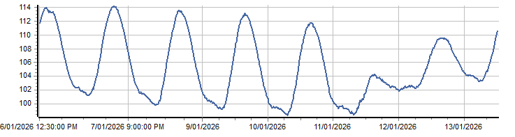 | PROVISIONAL WATER INFORMATION Site: WQ420022 Upper Canal - Prospect (HPR1) - Dissolved Oxygen Sat % Report generated: 13 Jan 2026 @ 10:25 AEST | ||||||||||||||||