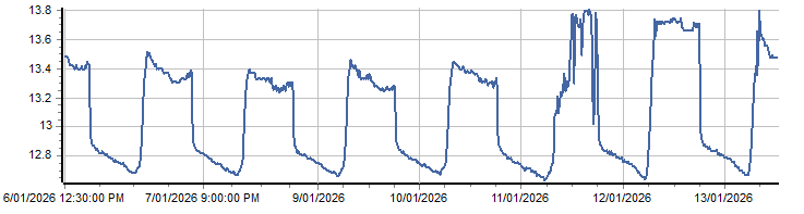 | PROVISIONAL WATER INFORMATION Site: 568183 Amgrow - Battery Volts Report generated: 13 Jan 2026 @ 10:25 AEST | ||||||||||||||||