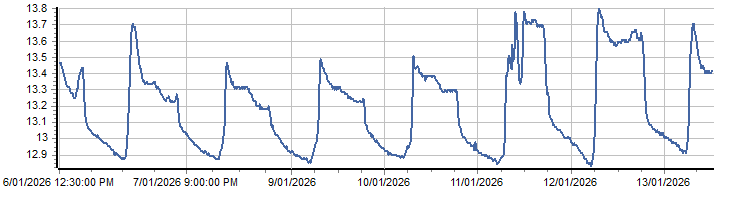 | PROVISIONAL WATER INFORMATION Site: 570347 Oallen - battery voltage Report generated: 13 Jan 2026 @ 10:25 AEST | ||||||||||||||||